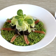 To serve the dish, place the oatmeal on a plate, top with strips of Parma ham. Sauté the snails in the remaining butter and place them on the oatmeal. Garnish with thinly sliced fennel mixed with sherry vinegar and walnut oil.