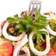 Combine the octopus and squid with the vegetables and lemon zest. Season the salad with the prepared mixture of lemon juice, olive oil, and spices.