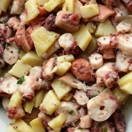 Before serving, cut the octopus and arrange it on warm plates with the vegetables.