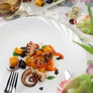 Whisk the vinegar with the olive oil, then add finely chopped garlic and basil. Combine the sweet potato, sauce, octopus, peppers, roasted onion, and olives, which can be pitted beforehand.