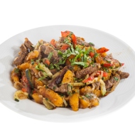 Peel the pumpkin, remove the seeds, and cut it into small sticks. Cut the veal into pieces of the same size.