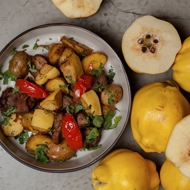 Add the pork to the quince and onion, and after 5–7 minutes, add the halved potatoes.