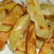 Line a baking sheet with parchment paper and arrange the potato sticks spaced apart. Place in a preheated oven at 392°F (about 400 degrees Fahrenheit) and bake for approximately 25 minutes (depending on your oven). The potato should have a golden crust and be soft inside. Be careful not to overbake.