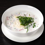 Boil the potatoes in salted water until tender, then dice them into 5 mm cubes. Hard-boil the eggs, peel them, and chop them in the same way as the potatoes. Cut the cucumbers and ham into the same size cubes. Slice the radishes into thin strips. Combine all the ingredients, season with salt and pepper, and serve in deep plates.
