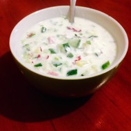 Okroshka with Salami on Kefir and Sparkling Water