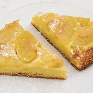Lay parchment paper on a baking sheet; remove the pie from the oven, take off the springform pan, place the pie on the baking sheet with the apples facing up, sprinkle with the remaining powdered sugar, and return to the oven for another 5 minutes.