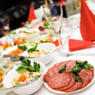 Cut the cervelat into very small cubes. Combine the vegetables, eggs, cervelat, and green peas in a deep bowl, season with salt and pepper, add mayonnaise, and mix well. Transfer the Olivier salad to a serving bowl and sprinkle with finely chopped herbs.