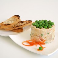 Boil the potato in salted water until cooked, cool, peel, and cut into small cubes. Peel and chop the onion.