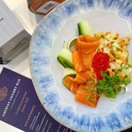 Place a portion of the salad on a plate and garnish it with three slices of fresh cucumber, pieces of lightly salted salmon, and some chiw salmon roe.