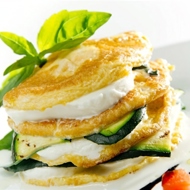 Layer everything into a pyramid. Start with a layer of omelet, then place a circle of mozzarella on top, followed by a strip of zucchini and a fresh basil leaf. Repeat until all components are used up.