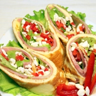 Place slices of thinly sliced ham, lettuce leaves, and the cottage cheese mixture with pepper on the omelet. Roll it up and cut diagonally.