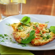 Transfer the omelet to a plate. Sprinkle with herbs. If there are any leftover Parmesan, you can sprinkle it on top as well. Serve with sour cream-tomato sauce, a tomato, and anything else you like or find appropriate.