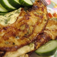 Finely chop the herbs, mix with the eggs, and whisk. Add warm milk and whisk again. Quickly sauté the tomatoes and finely chopped onion in vegetable oil over high heat for about 1 minute.