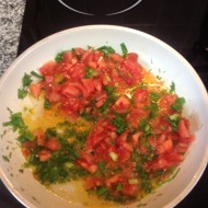 Melt the vegetable oil in a frying pan. First, lightly sauté the onion, then add the greens, and finally the tomatoes (they should not become too soft).