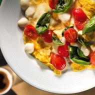 This is an egg version of the famous Caprese salad and Neapolitan pizza. The tomatoes, mozzarella, and fresh basil must be of good quality. The eggs for this omelette, like for most flat omelettes, should be mixed with a fork rather than whisked into a froth. This mixing method results in a more accurate, cohesive, and uneven texture. You can substitute butter with olive oil.