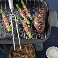 Light the barbecue. Place the onglet steaks on one side of the grill and the asparagus wrapped in bacon on the other. Grill the meat for 4-8 minutes on each side, and the asparagus for 4 minutes on each side. Season the onglet steaks with salt and pepper at the end of cooking. Serve with confit shallots.