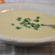 The soup can be served with herbs, croutons, almond flakes, or cubes of crispy bacon, and sprinkled with Parmesan, etc.