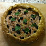 Remove the pits from the olives and arrange them on top. Drizzle with oil and place in a preheated oven at 356°F for 20–30 minutes.
