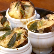 Grill the ciabatta pieces, cover each pot with a piece of ciabatta, grate cheese on top, add sage leaves, and drizzle with olive oil.