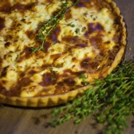 Take the base out of the oven and spread the onion with thyme evenly over it. Now place the goat cheese on top: it’s easier to place it in small pieces and then gently spread it out (it shouldn’t cover the onion in an even layer). Whisk the cream with the eggs and pour it over the top. You can sprinkle a little more thyme on top, and now everything is ready to go back in the oven at 347°F for 22–25 minutes. A golden crust on top, as in the photo, is a sure sign of readiness!