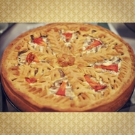 From the remaining second part of the dough (the one that was 1/3 of the total amount), make the top decorations. Roll it out into 8 equal strips, each the length of the radius of your pan. Cut each strip on both sides with a knife and arrange them symmetrically on the pie. Use a few more strips, cut on one side, to frame the pie around the edge. Pinch their edges together with the sides. In the center, you can make a flower, and decorate the gaps with thin slices of tomato. But the decoration of the pie can be absolutely anything; there are no limits to your creativity and imagination.