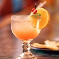 Pour in the champagne, garnish with a cherry and a slice of orange.
