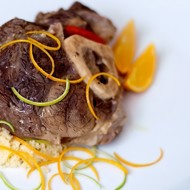As soon as the meat was browned, I poured in the wine and let the liquid simmer for 5 minutes. Then, I added hot water to the pot, almost completely covering the pieces of osso buco. I added the orange juice to the boiling broth along with thyme and rosemary.