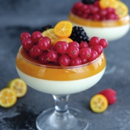 Remove from heat, add gelatin, and blend with an immersion blender. Pour the panna cotta into glasses.