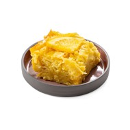 Cut three round slices from the orange, about 3–5 mm thick, and arrange them in a single layer at the bottom of a small baking dish.