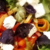 On top of the salad greens, place the pepper and form roses from the pumpkin shavings; scatter the short shavings randomly.