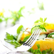 Make the dressing: add the juice of half an orange to the juice already in the bowl. Add the vinegar and season with salt and pepper. Add the mint and olive oil, and whisk with a fork.