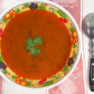 Remove the soup from heat, let it cool, and place it in the refrigerator for an hour. Before serving, add a spoonful of yogurt to each bowl, pour in the soup, and garnish with a slice of orange.