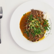 Use a slotted spoon to remove all the fat that has formed on the surface. Return the vegetables to the sauce, season with salt and pepper to taste. Before serving, cut the cooking twine from the meat, place it on a plate, and drizzle with the sauce and vegetables. Add horseradish, and sprinkle with finely chopped parsley, grated lemon zest, and pepper.