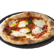 Before baking the pizza, place an inverted baking tray in the oven. Set the oven to the maximum power — if your oven does not support temperatures below 518°F, you will need to turn on the convection setting while baking the pizza. Prepare the pizza: place the ball of dough on a floured board. Flatten it into a disc, then shape the crust by hand, starting from the center: the edges should be thick while the center remains thin.