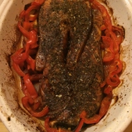 Preheat the oven to 180–392°F. Grease a baking dish with a small amount (less than a teaspoon) of sesame oil, place the fillets in the dish, and add red pepper between the pieces of fish. Drizzle with soy sauce, squeeze lemon juice on top, taking care not to include the seeds (as they can add bitterness), sprinkle with seasoning, and bake in the oven for 30 minutes.