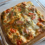 Add the sausages, cheese, tomato, and dill to the egg mixture.