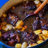 In a clean pot, combine the meat, vegetables from the broth, and the roasted vegetables from the oven. Pour in the degreased broth and simmer on low heat until the liquid reduces by one third and the flavors meld together.