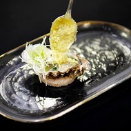 Serve the oysters with celery (both green and white), apple sauce, herb-infused butter, and mustard-cucumber granita.