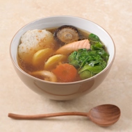 Slice the chicken and salmon into thin long pieces; peel the potato and carrot, and cut them into 0.5 cm slices; bring 600 ml of water to a boil, add dashi powder, stir, and toss in the sliced vegetables.
