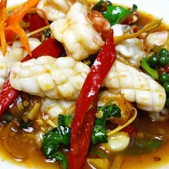 Clean the squid and shrimp, leaving the tails on the shrimp for presentation. To make the squid look nice, use the age-old Asian technique: score the squid flesh on the inside in a crosshatch pattern, but do not cut all the way through. The squid will curl into appetizing 'hedgehogs' when fried and will absorb the sauce better.