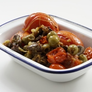 Fresh tomatoes in the fall are not quite the same as those in summer, but roasting them in the oven concentrates their flavor and removes excess moisture, enhancing their presence in any dish. In this recipe, the hearts are sautéed separately in a pan before being combined with the roasted tomatoes. One element is soft, sweet and sour, with a jelly-like consistency, while the other has a spicy crust and a hearty texture. The contrast is complemented by butter, which, melting over the hot dish and absorbing the tomato juice along with the aroma of garlic and thyme, transforms into a delicate sauce that doesn't overpower the main ingredients, but rather adds a subtle intrigue, similar to the creamy notes found in a good red wine. This dish is versatile: the hearts with tomatoes can be enjoyed on their own, served on bread, or used as a base for risotto or pasta.