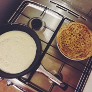 Pierce half an onion with a fork, dip it in sunflower oil, and grease the hot frying pan. This should be done approximately after each pancake is cooked (hopefully not a mess).