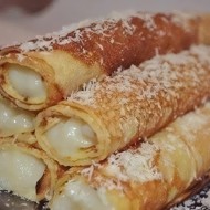 Place a pancake on a board and trim the edges. On the edge of the pancake, place 2-3 tablespoons of custard, spreading it slightly, but leaving most of the custard at the edge. Carefully roll the pancakes into a tube. Repeat this with all the pancakes.