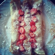 Heat a frying pan and add sunflower oil. Fry the pancakes. In the warm pancakes, add mascarpone cheese and roll them up.