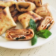 Cut the pancake into 4 pieces and place on it: basil, chopped cottage cheese, salmon, and wrap it into an envelope.