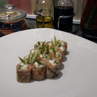 For the filling: Cut the salmon and cucumber into strips and evenly distribute the filling.