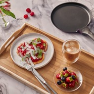 Place the finished pancakes on a plate, drizzle with the strawberry coulis, and garnish with coconut slices and mint leaves.
