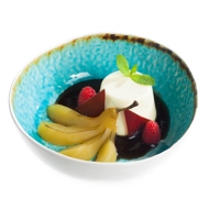 Prepare the pear in syrup. Peel the pear. Cut it in half and remove the core. Place the pear in cold water with lemon. Meanwhile, make the syrup: heat cinnamon, star anise, cardamom, and the zest of one orange in a saucepan. Add wine, saffron, orange juice, and sugar. Once the sugar dissolves and the mixture boils, add the pears to the syrup so they are completely submerged. Cover the syrup with parchment paper to let the pears steam in the syrup. Cook for 8 minutes, then turn off the heat and let it cool to room temperature.