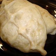 By this time, the dough should have risen. So, punch down the dough, roll it into a log, and divide it into 12 pieces. Roll each piece out like for good pastries, about 4 mm thick (you can make it a bit thinner; I think that won't hurt). Place the filling on the dough circles and pinch them closed like dumplings. Now remember and write down this important note: THE DOUGH SHOULD NOT TEAR OR PULL AWAY FROM THE EDGES. So, seal the edges well, and if it happens to tear somewhere, tear off a bit of dough and try to patch it up. Now dip the bottoms in the oil left from the dough rising and place them in a steamer (give each bun plenty of space—they will rise well), put on the heat, and forget about them for 45 minutes.