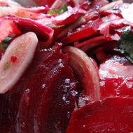 Do the same with the radishes — slice, mix with oil, and combine with the beets.